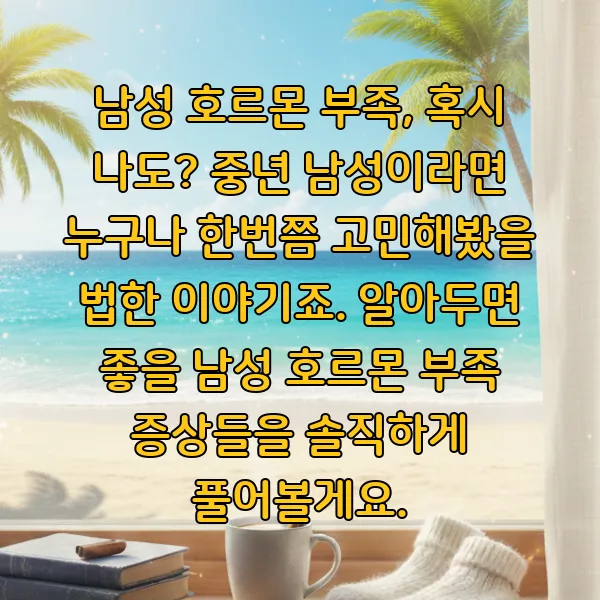 지금까지 남성 호르몬 부족 의 다양한 증상들과 더 알아두면 좋을 정보들을 이야기해 봤어요. 혹시 오늘 제가 말씀드린 내용 중에 "어? 나도 그런데?" 하는 부분이 있다면, 너무 걱정부터 앞세우기보다는 찬찬히 자신의 몸 상태를 점검해보는 시간을 가져보시는 게 어떨까요?